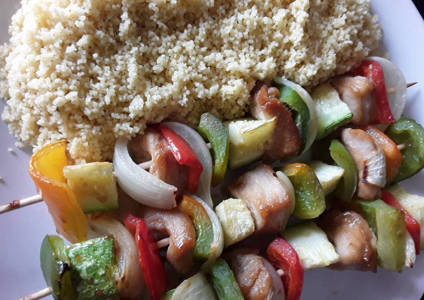 Brochetas de pollo marinado con verduras