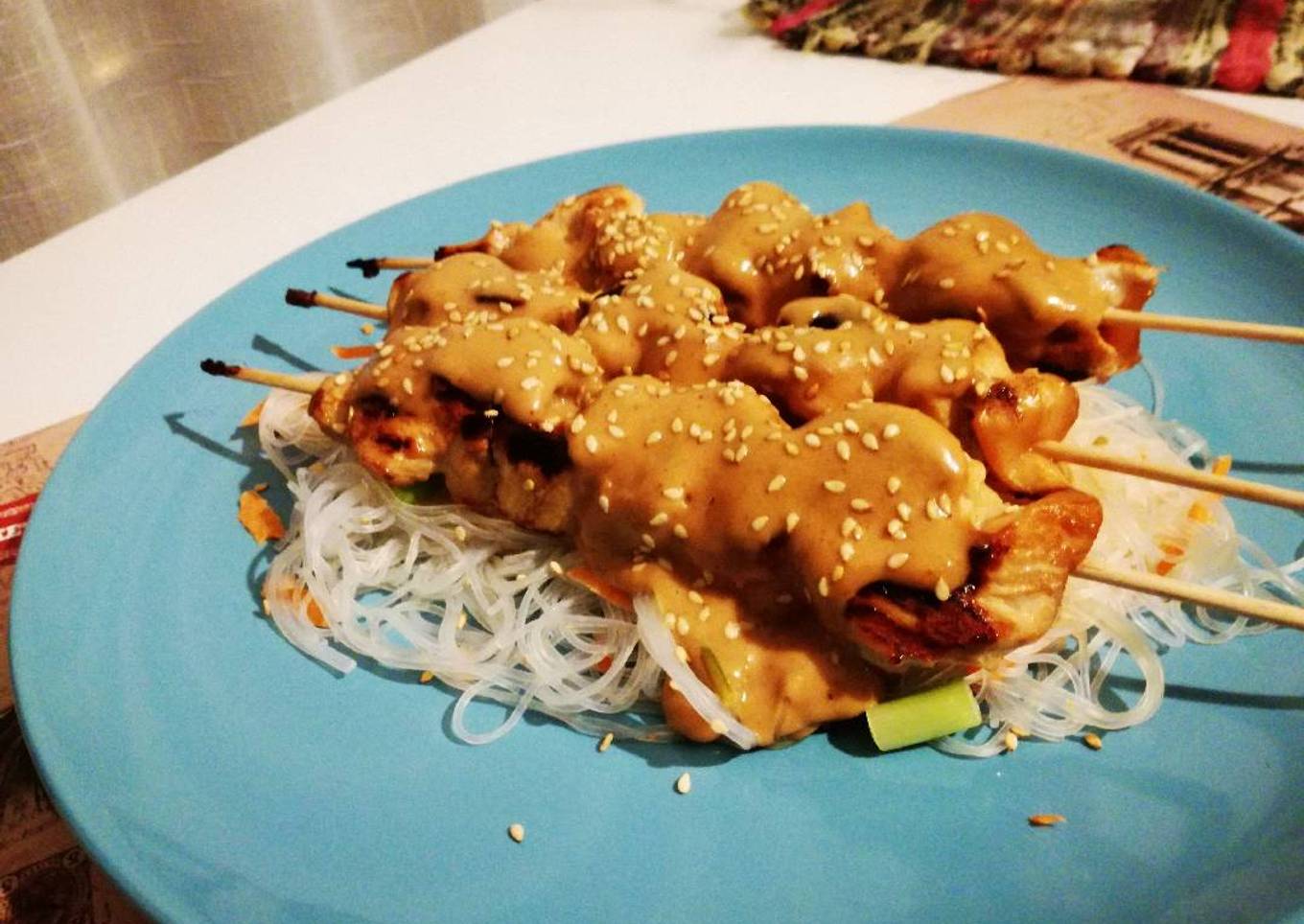 - A la hora de emplatar poner la mezcla de los vermicelli, encima la brocheta y rociar con la salsa y por encima unas semillas de sésamo. ¡A disfrutar!