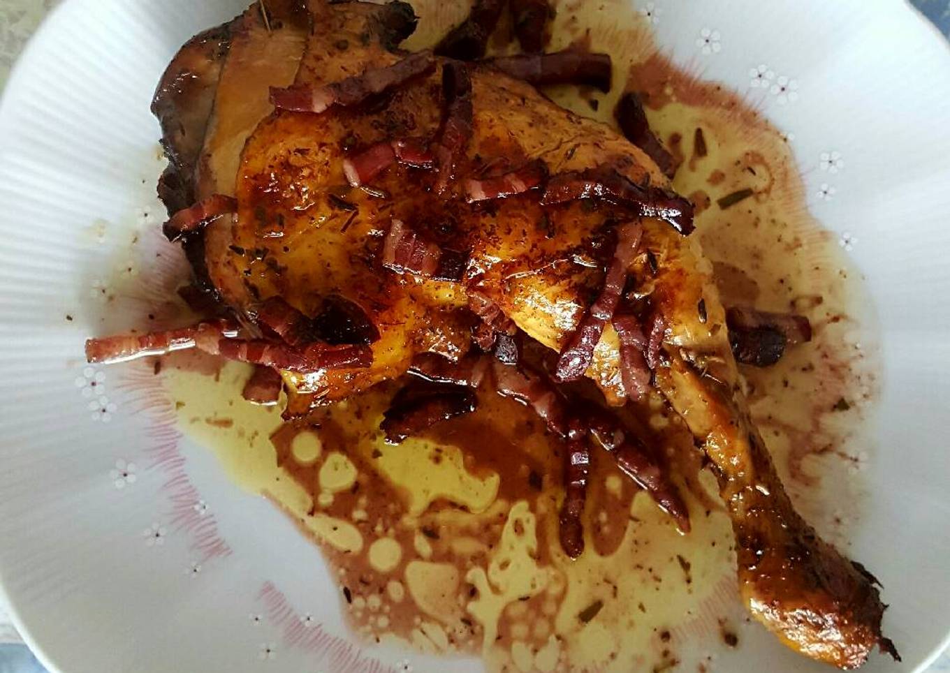 Instructions to make to make Pollo al horno con beicon en salsa de vino tinto