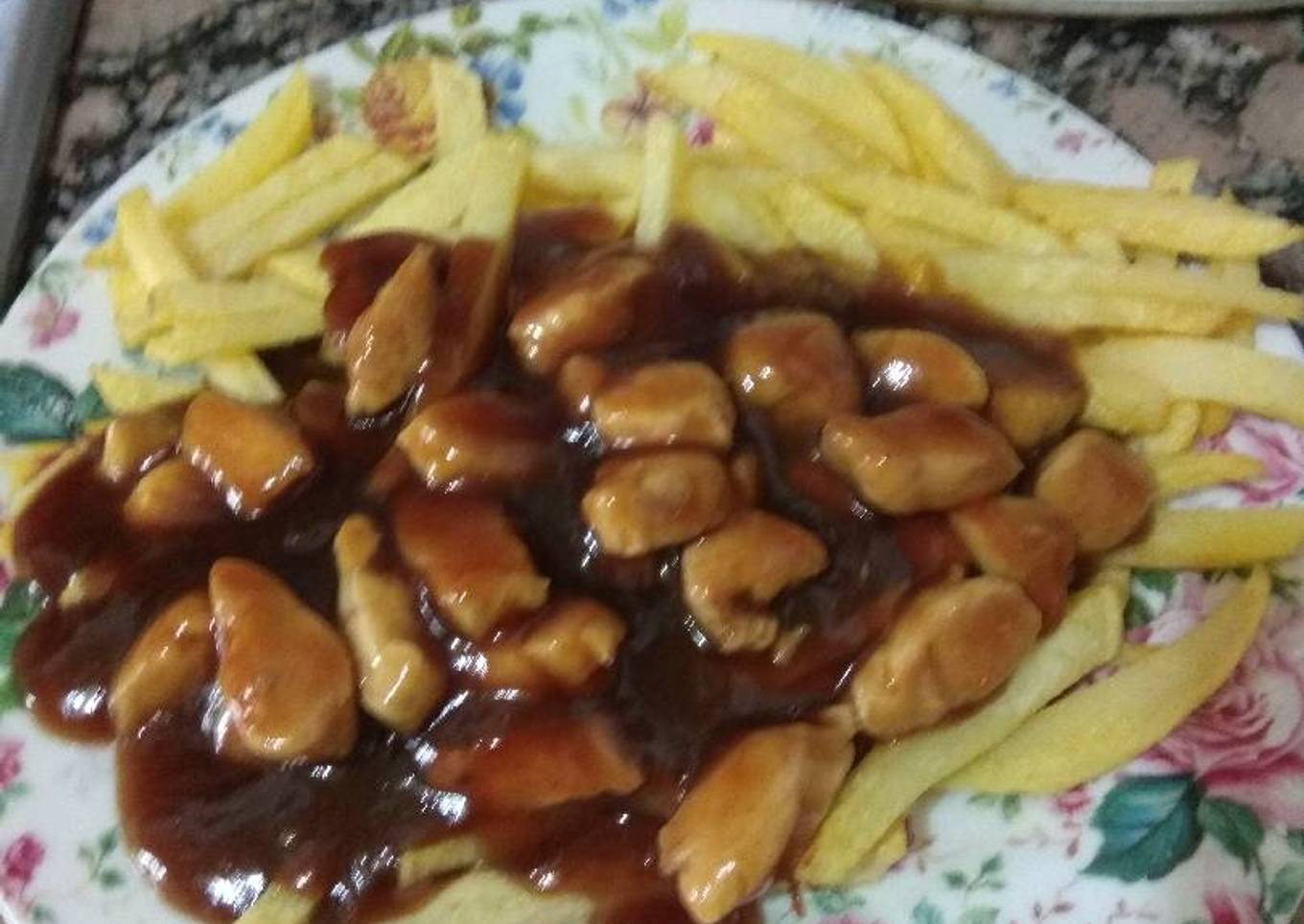 Pollo estilo chino con patas fritas