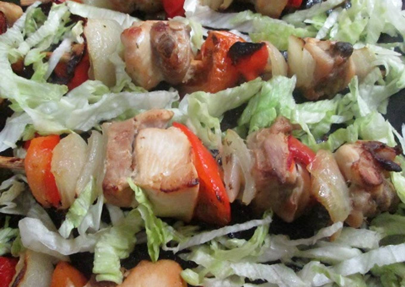Brochette mixto de carne de pollo y de cerdo, con cebolla, tomate y pimiento.