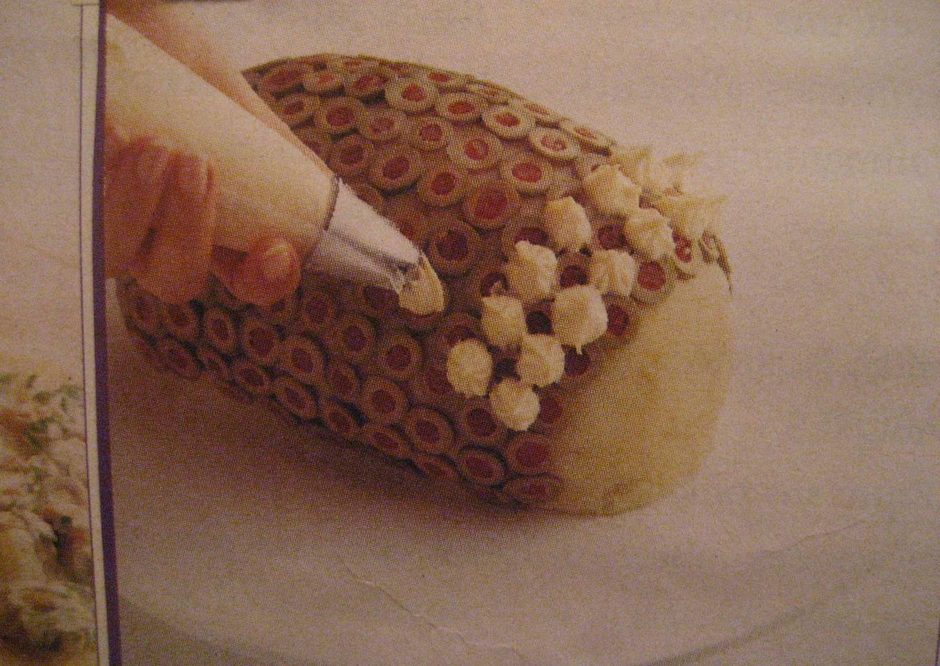 - ADORNAR EL ROLLO CON LAS ACEITUNAS CORTADAS EN RODAJAS Y PUNTITAS DE MAYONESA COMO SI FUERA LA CORTEZA DE LA PIÑA PARA ADORNAR SI SE TIENE EL PENACHO DE LA PIÑA IDEAL SI NO PONER UN COGOLLO DE LECHUGA BIEN ABIERTO