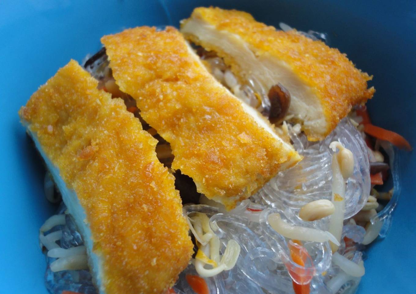 - Servimos en un cuenco la mezcla anterior y, colocamos encima unas tiras del filete de pollo empanado.