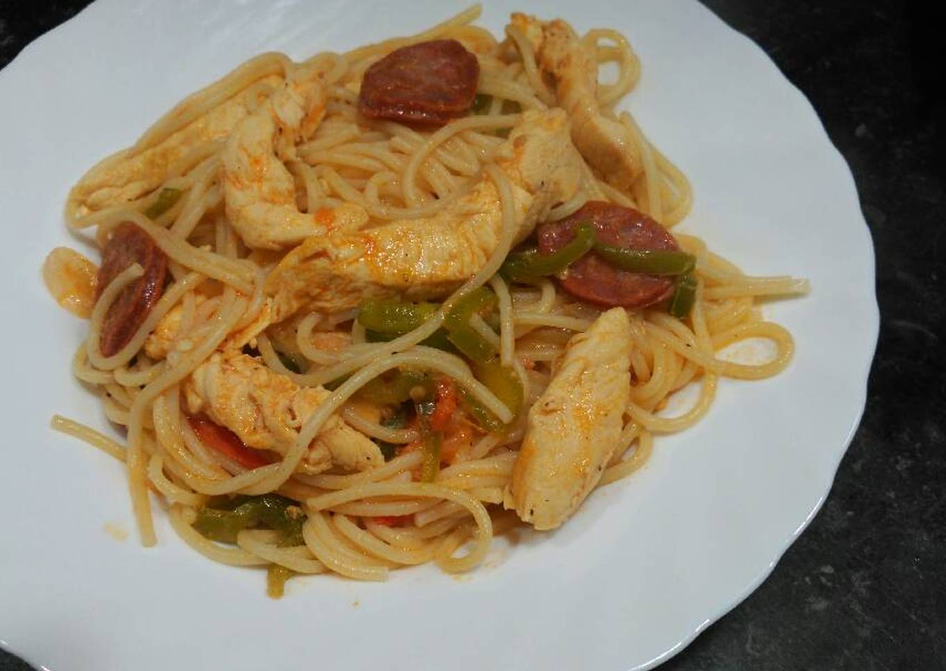 Espaguetis con pollo y chorizo