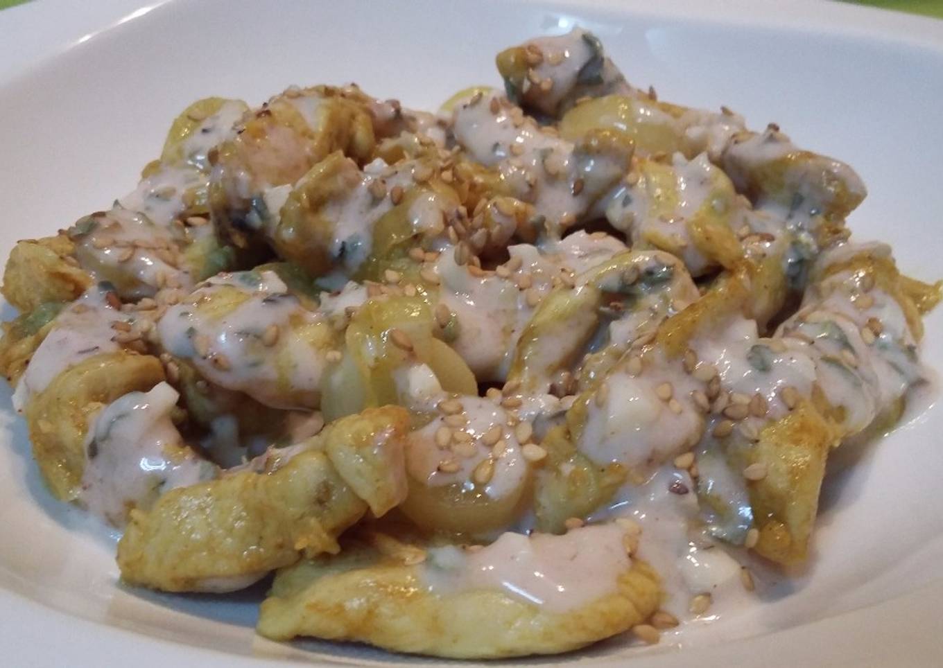 - Añadimos un poco de salsa por encima y para rematar la faena agregamos unas semillas de sésamo. Listo para comer nuestro pollo aromatizado con salsa de yogurt, espero que os guste.
