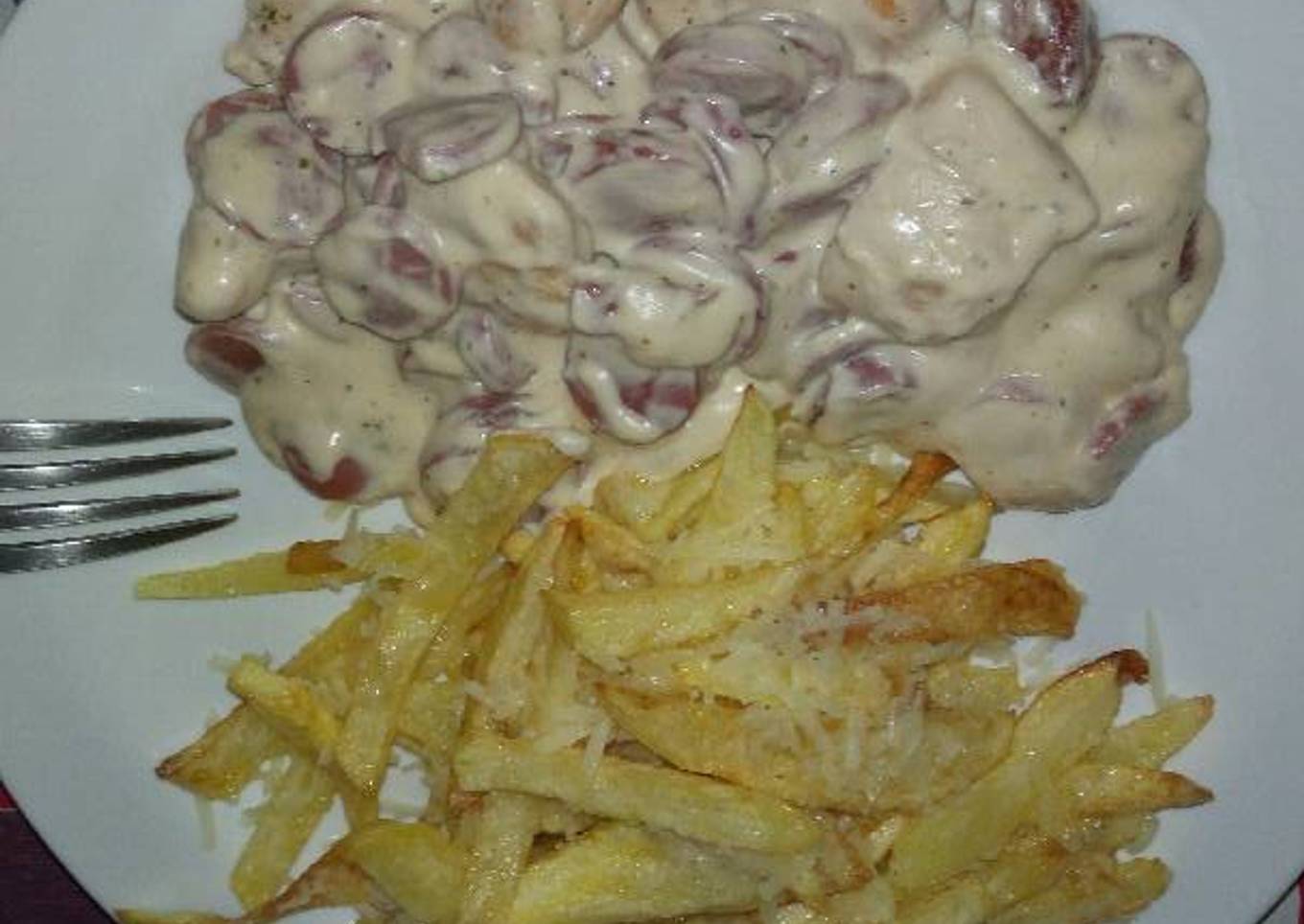 Pollo con nata y salchichas