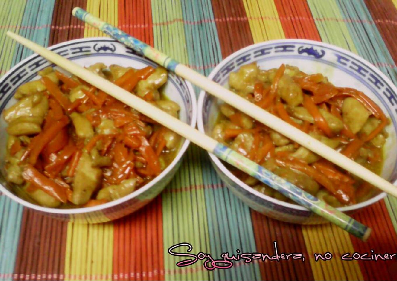 - Emplatar a vuestro gusto. Yo lo he puesto en cuencos chinos y lo comemos con palillos acompañado con arroz tres delicias.