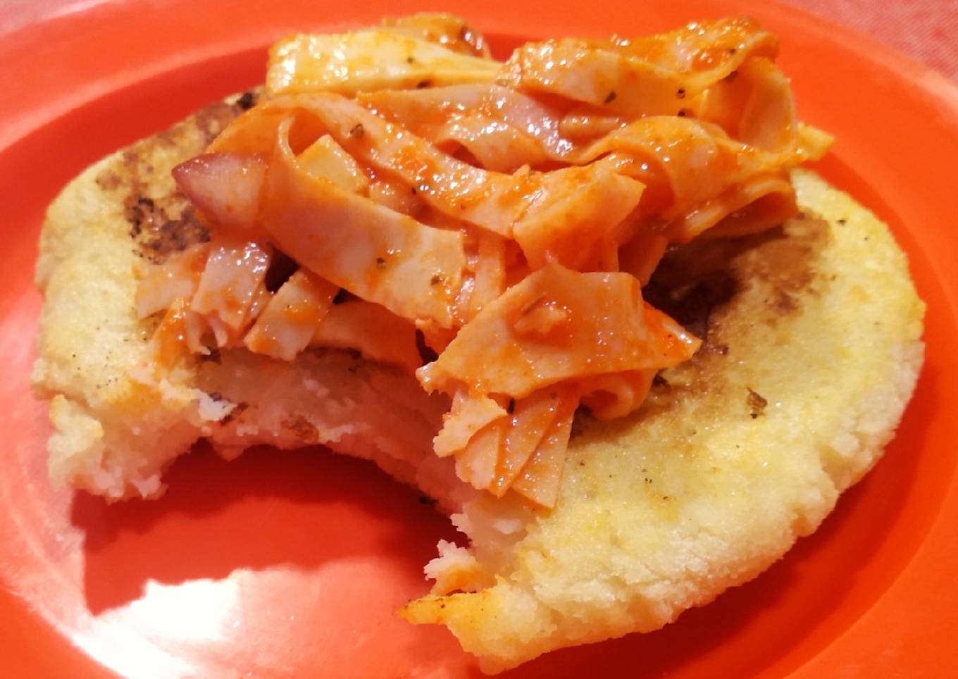 Instructions to make to make Arepa con pechuga de pavo, queso y pimiento