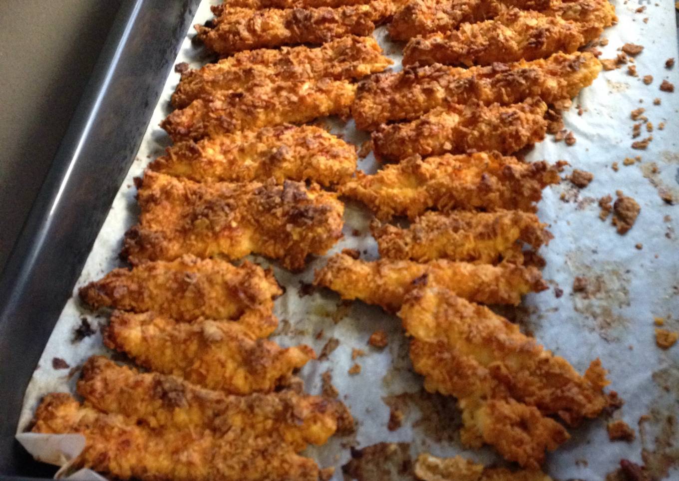 - Seguidamente, cogemos trozo por trozo y lo rebozamos. Primero en harina, luego en huevo y finalmente en DORITOS. Vamos poniendo los trozos en la bandeja del horno.