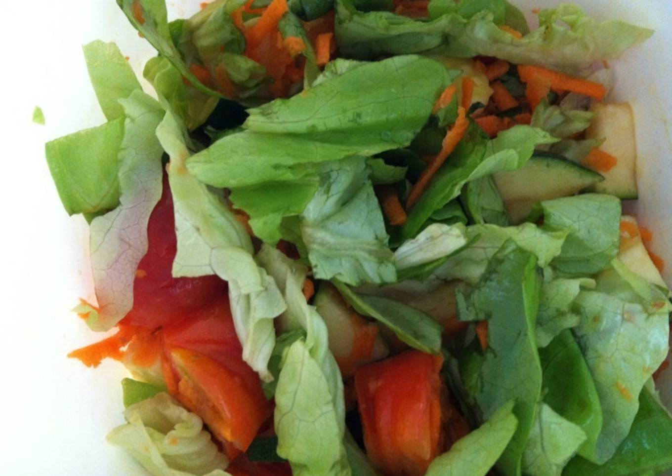 La ensalada con calabacín, tomate y lechuga fresca además de pavo o pollo a trozos... si tengo aguacate también se lo pongo.