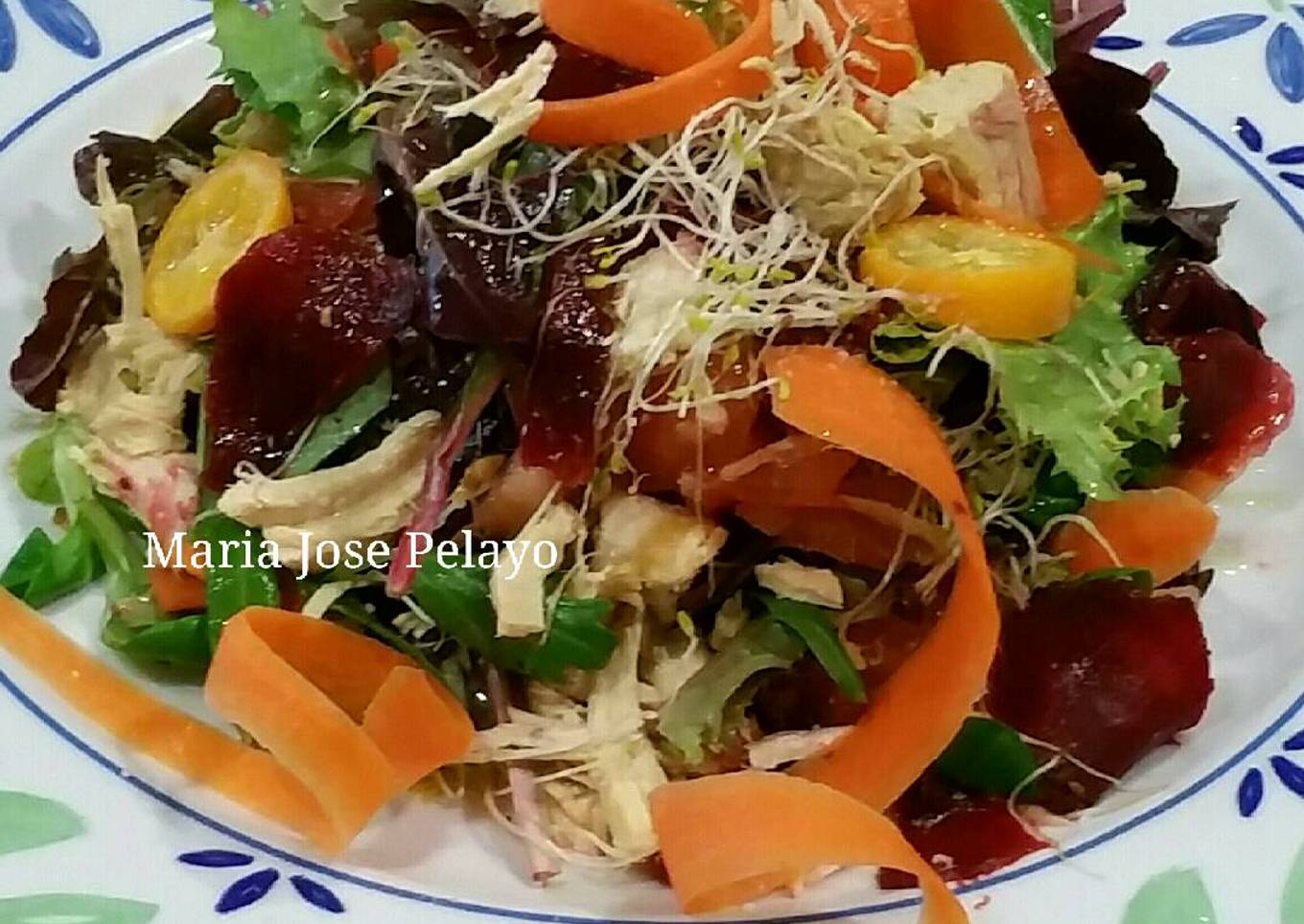 - Se colocan en un plato mezclando todo con la pechuga la zanahoria en tiras con la remolacha en tiras y el pollo el tomate en daditos todo bien colocado y el toque de las naranjas enanas que dan un toque de frescura.
