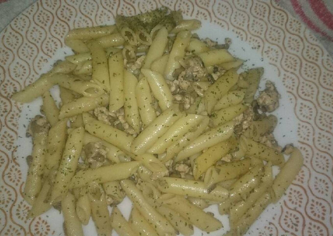 Macarrones con chanpiñones y pollo