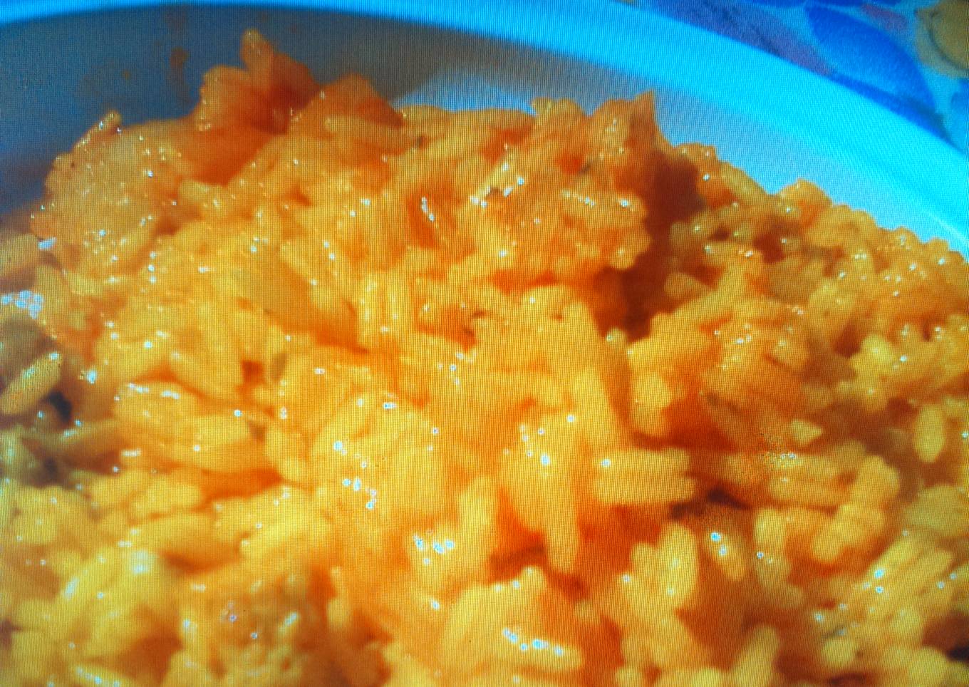 - Añadir el tomate frito, remover durante 5 minutos y añadir el arroz. Seguir removiendo 3 minutos.