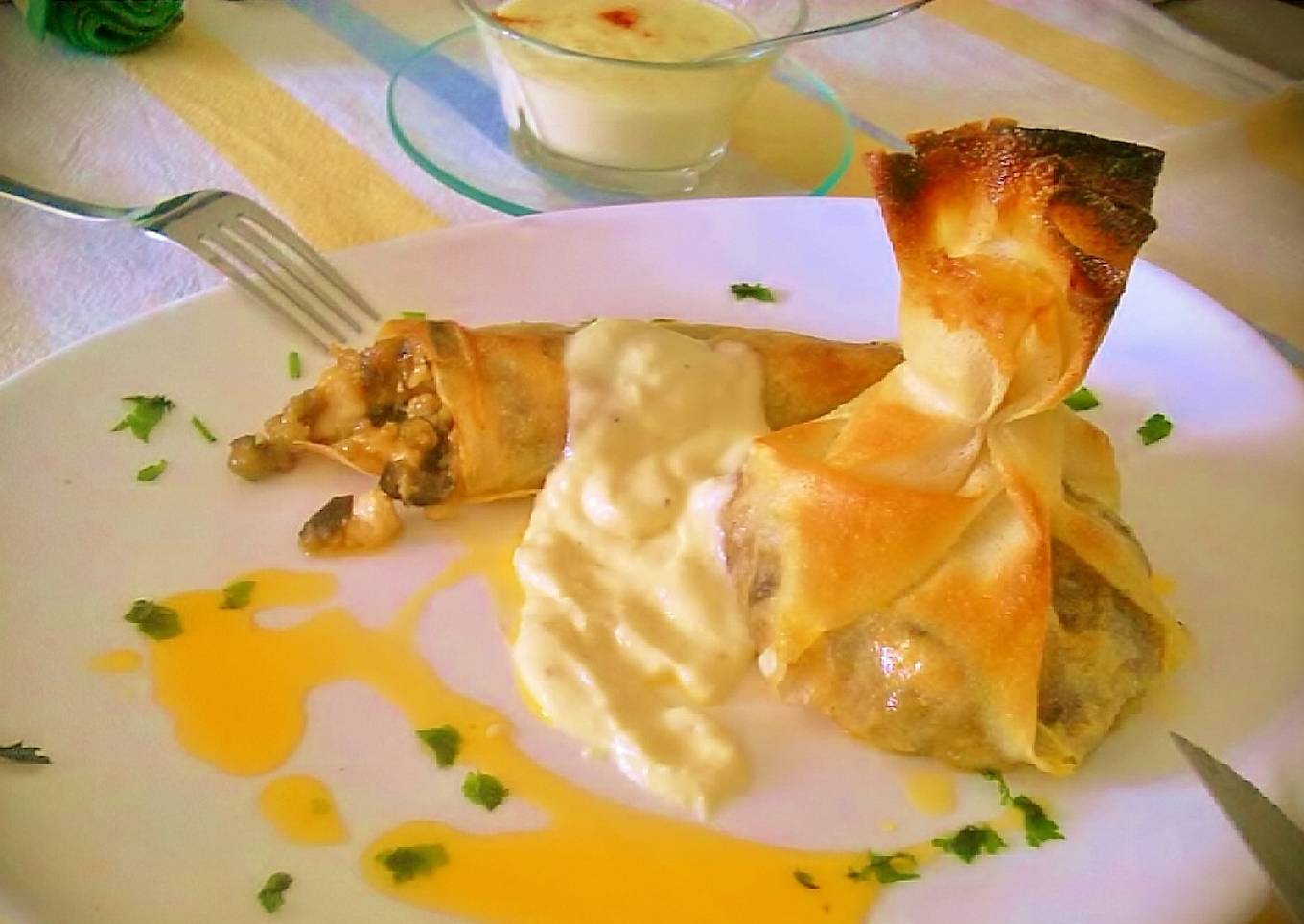 - Una vez frío el relleno, abrimos las láminas de brick y ponemos relleno, podemos enrollarlo como rollitos de primavera o en saquitos y atados queda muy bonito