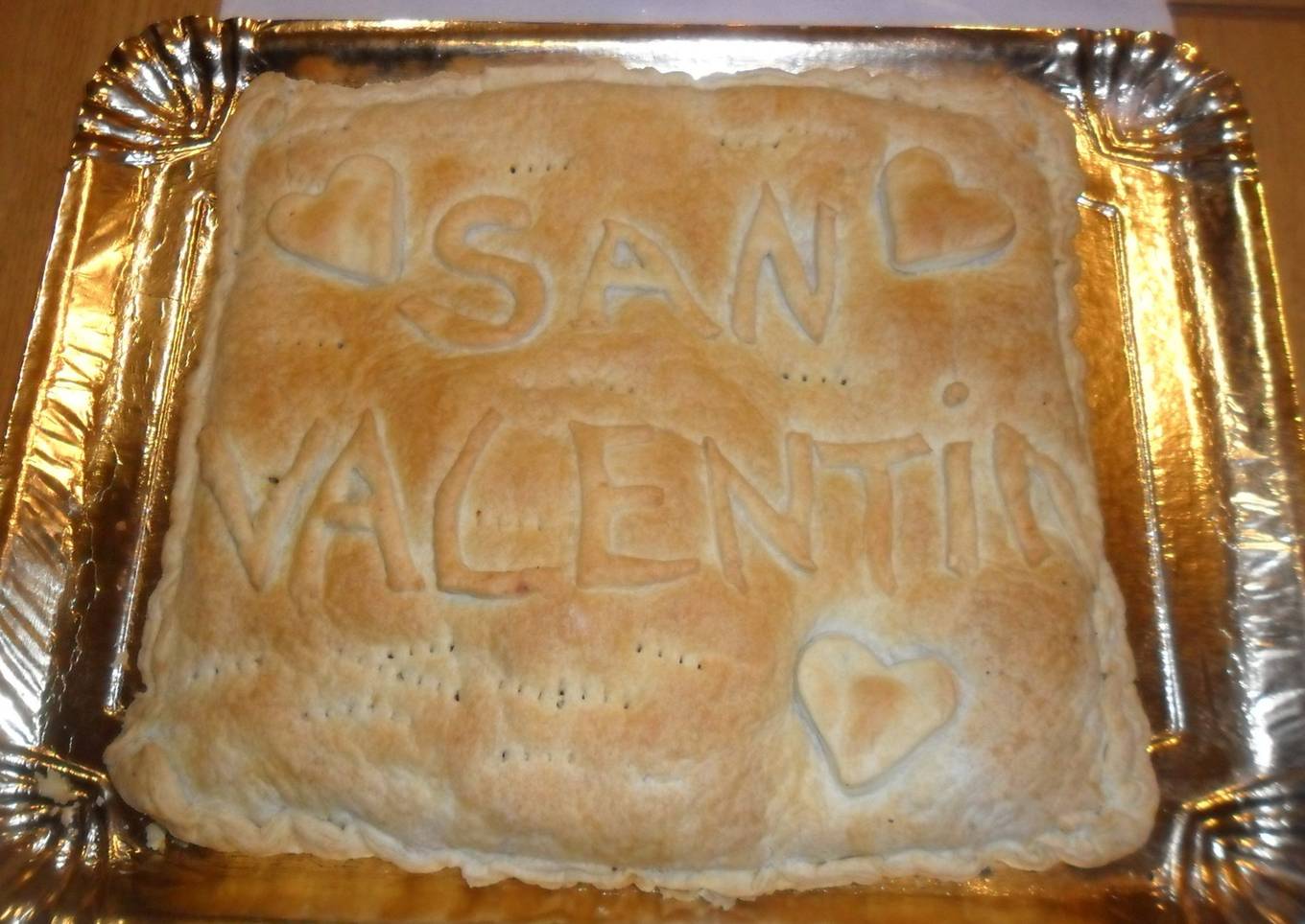 - Con los recortes de masa hacer las letras y los corazones que decoran la tarta. - Hornear 20 minutos a fuego moderado hasta que se dore suavemente.