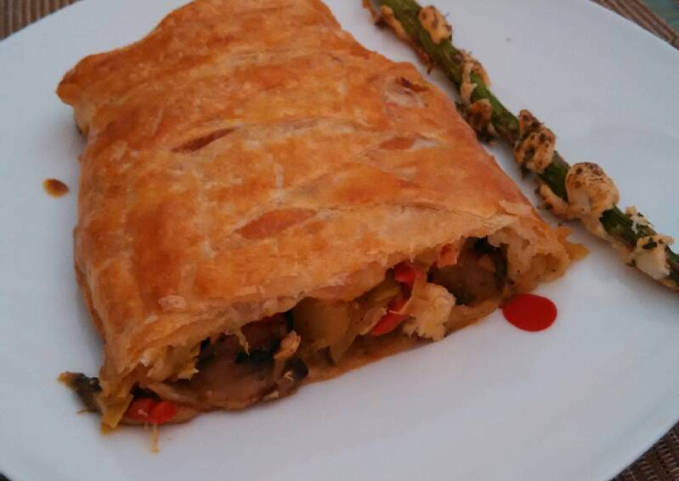 - Picamos las verduras, y empezamos a sofreir en éste orden, cebolla, pochamos y añadimos el puerro, pimiento rojo y amarillo, rehogamos a fuego medio, removiendo, añadimos el calabacin bajamos el fuego, removemos, añadimos las especies, tapamos la sartén. Cuando este a media cocción añadimos los champiñones. Removemos y tapamos, dejamos unos minutos y haciendo un agujerito en el centro de la sarten añadimos la pechuga picada en taquitos, salpimentamos la carne, y dejamos que se haga con la sarten destapada, cuando este medio hecha mezclamos todos los ingredientes, rehogamos unos minutillos y dejamos reposar