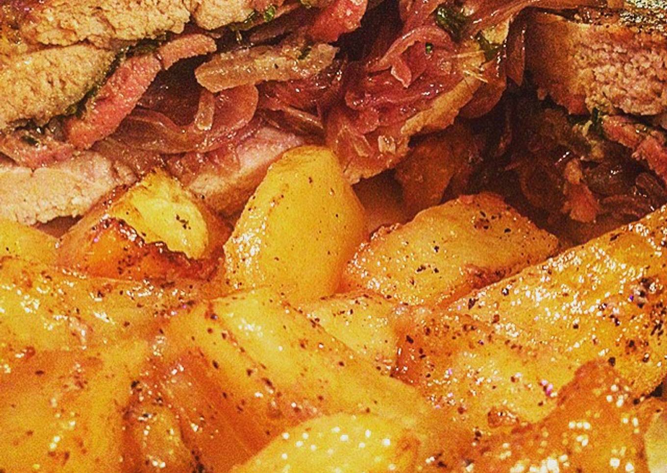 Solomillo relleno de panceta y verduras con patatas confitadas y cocinado al horno de leña