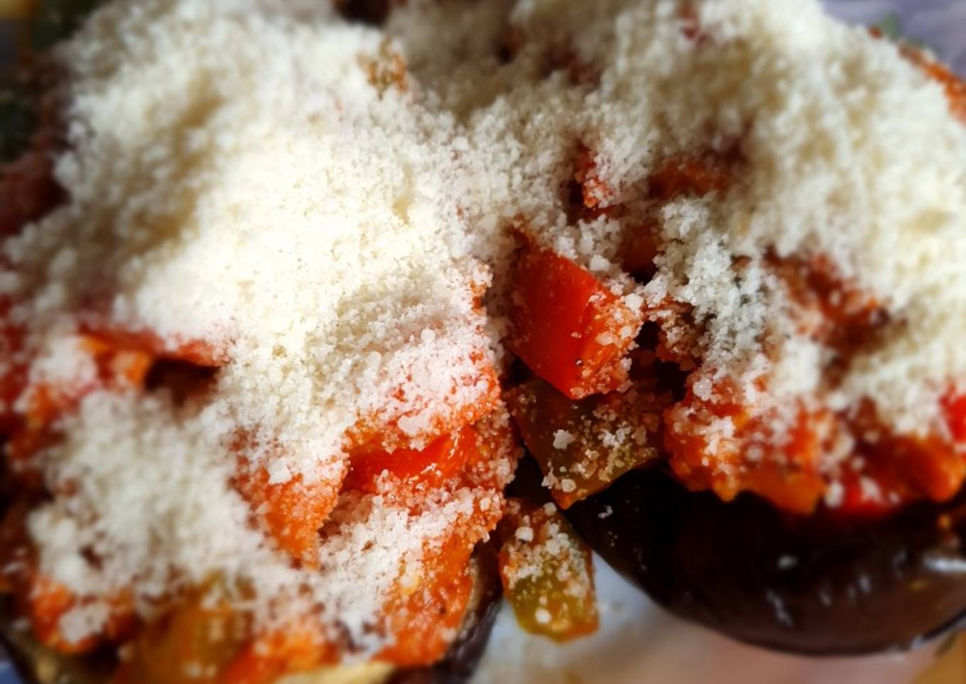 - Servir el relleno de la sartén sobre las dos mitades de la berenjena.