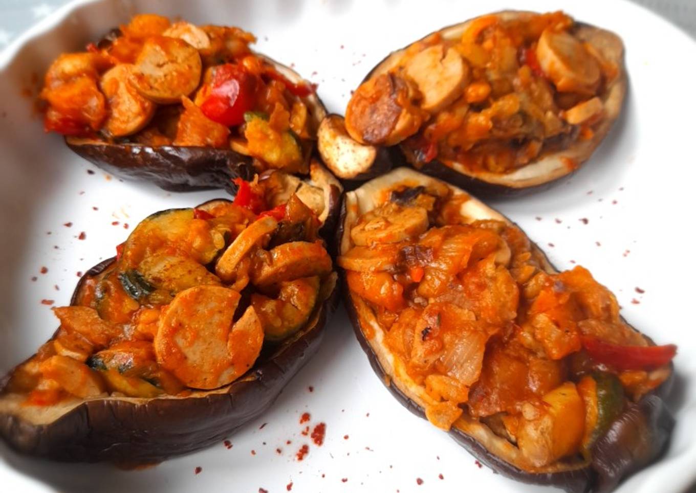 Berenjenas estilo Bratwurst con parrillada de verduras