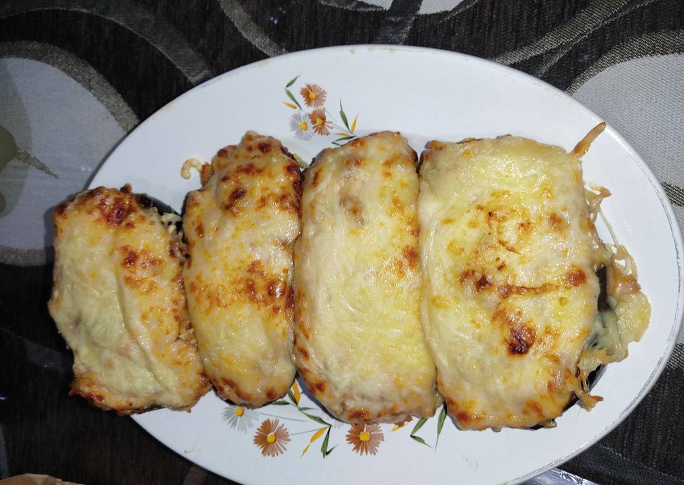 - Ponemos en una bandeja las cáscaras de las berenjenas y rellenamos con este relleno, le ponemos bechamel y queso rallado.