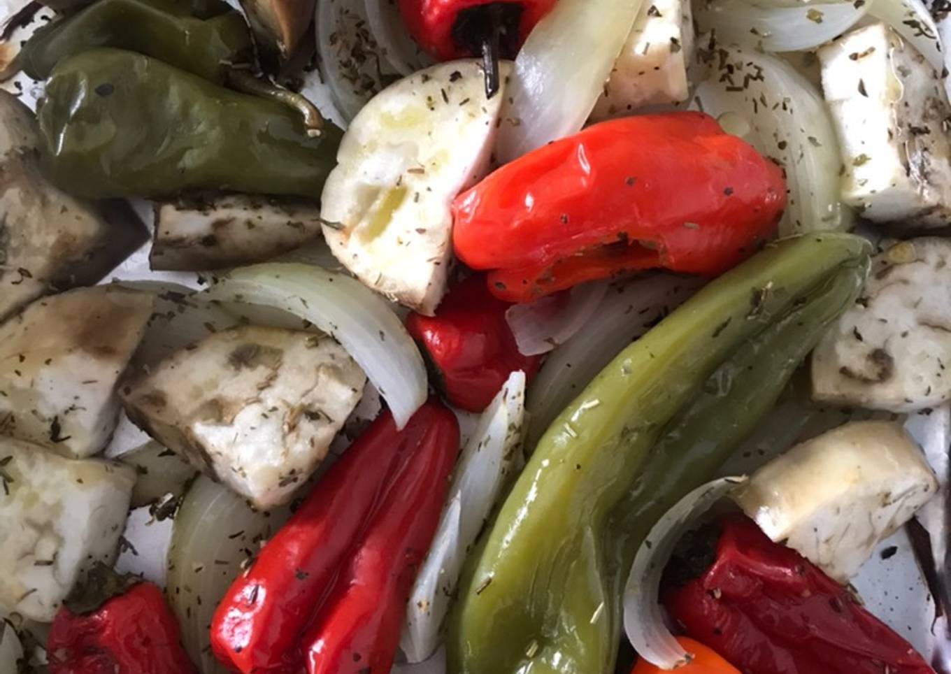 - Prepara una fuente de horno. Corta las verduras: la cebolla y la berenjena en trozos porque tardan más en cocinarse y los pimientos, enteros. Alíñalos con las hierbas y la sal.