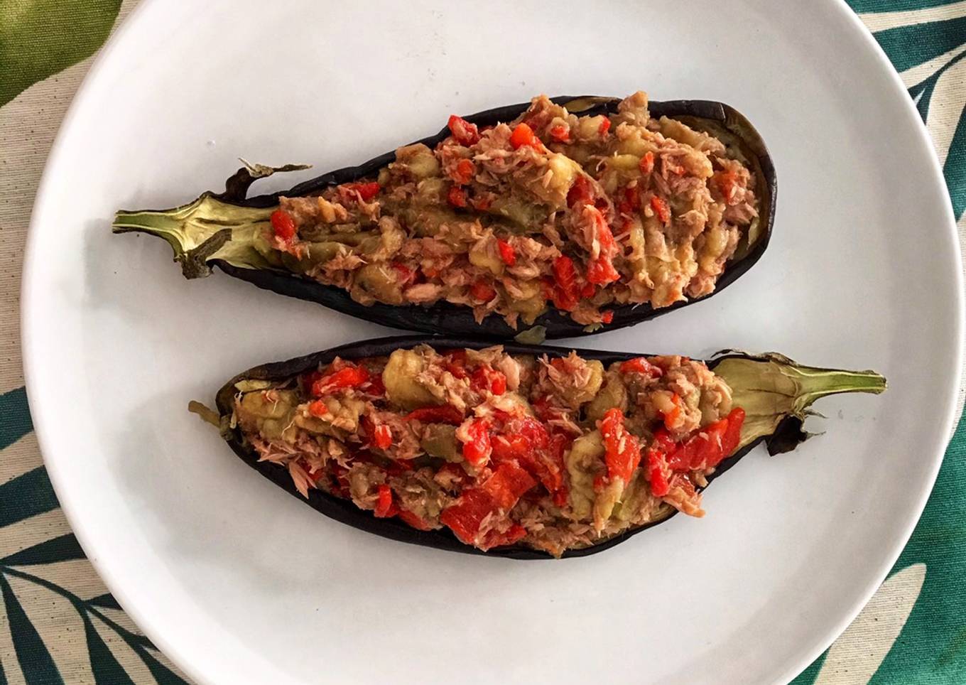 - Sacamos la berenjena del micro y le sacamos el relleno con una cuchara, lo mezclamos con el atún y el pimiento, y las rellenamos de nuevo