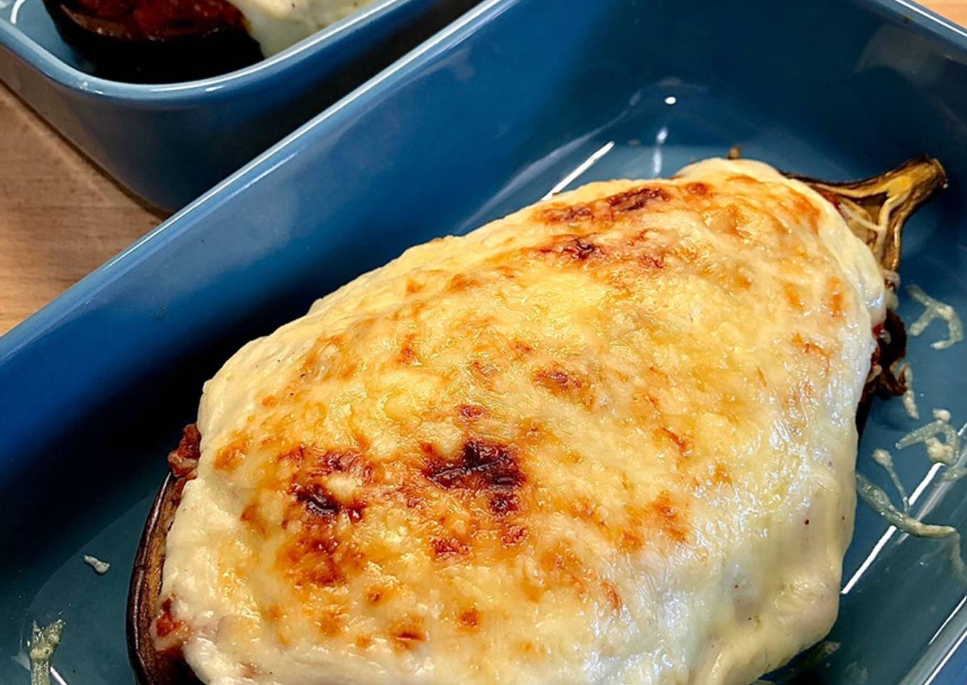 - Dejar que se haga a fuego lento una media hora, removiendo cada 5 minutos, hasta que se evapore casi todo el líquido. Repartir en las pieles de la berenjena (que tendremos en una fuente apta para horno) el relleno, echar un poco de bechamel por encima y espolvorear parmesano rallado.
