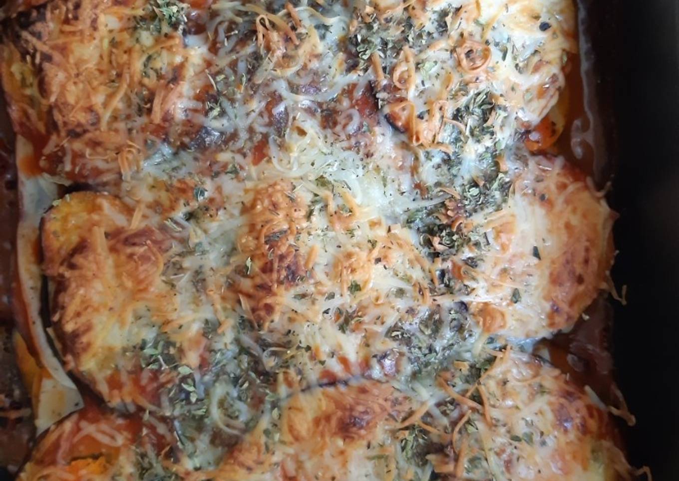- Repetimos la operación hasta hacer 3 capas de berenjena (como una milhoja de 3 plantas)