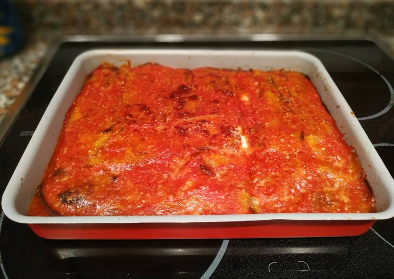- Cuando todas las láminas de berenjena estén fritas, unta la base de la bandeja de hornear con la salsa de tomate.