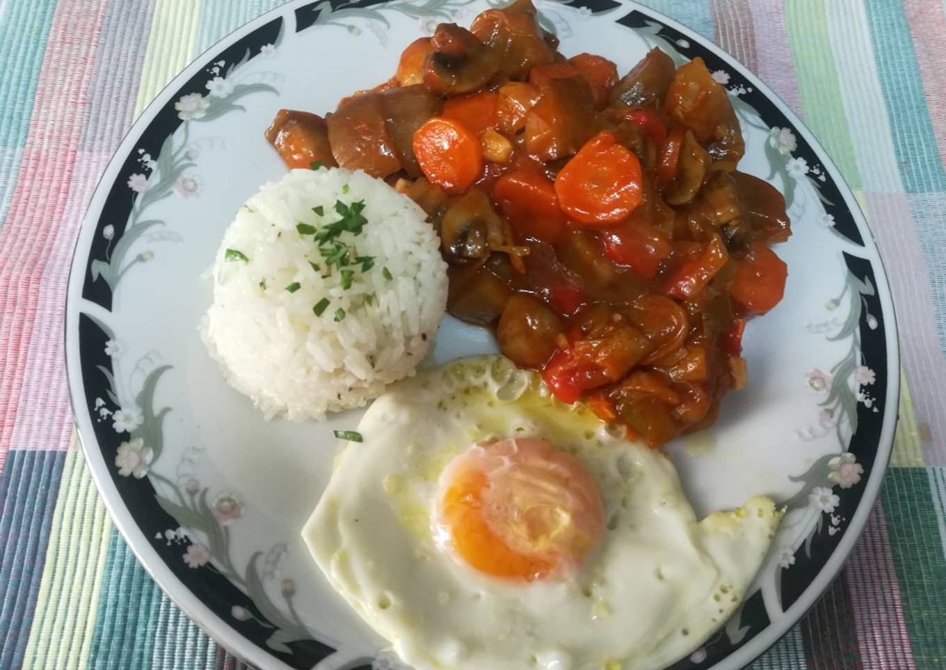 - Finalmente freímos el huevo con abundante aceite de oliva y una pizca de sal. Presentamos arroz, huevo y pisto en el mismo plato. Buen provecho!