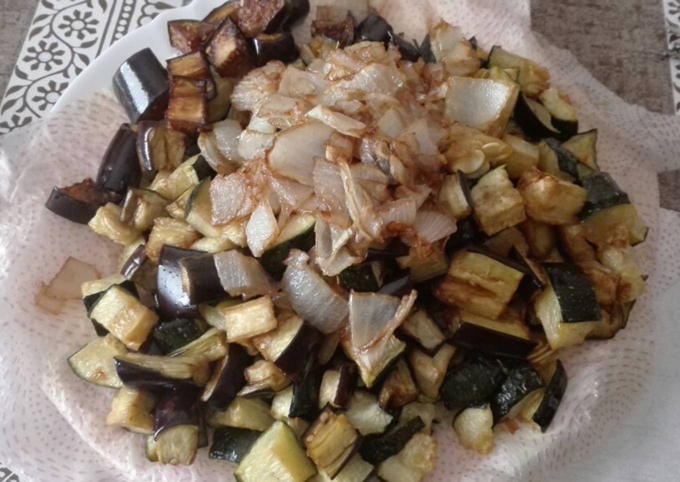 - En una sartén antiadherente con un poco de aceite oliva, freímos el calabacín, las berenjenas y la cebolla (previamente, lavadas y picadas). Salpimentamos. Una vez fritas las verduras, las retiramos del fuego y las ponemos en papel de cocina para que se absorba todo el aceite.