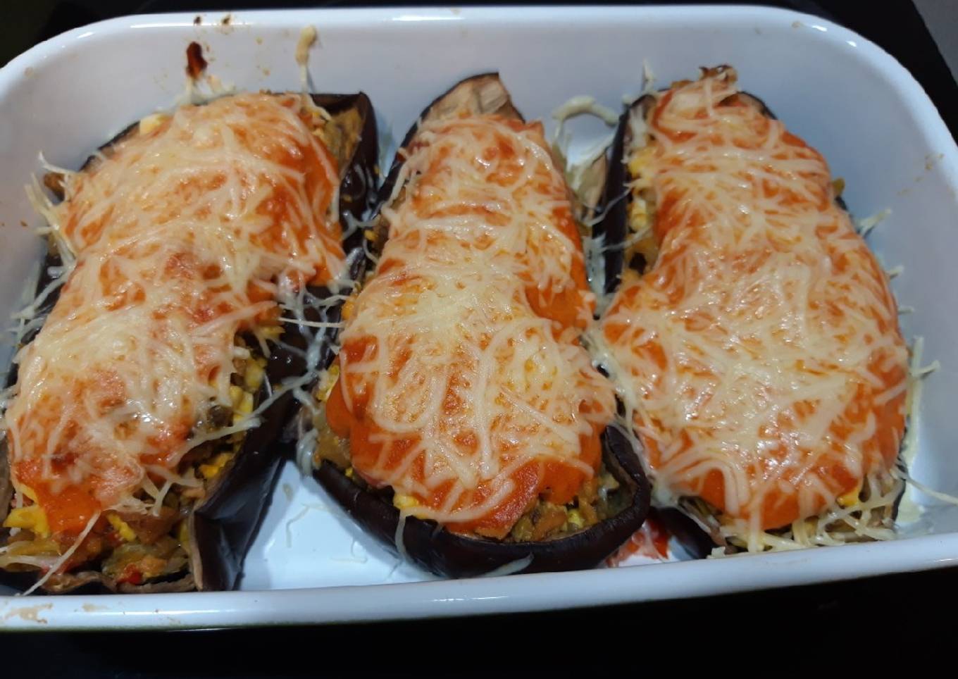 - Rellenamos las berenjenas con la mezcla.