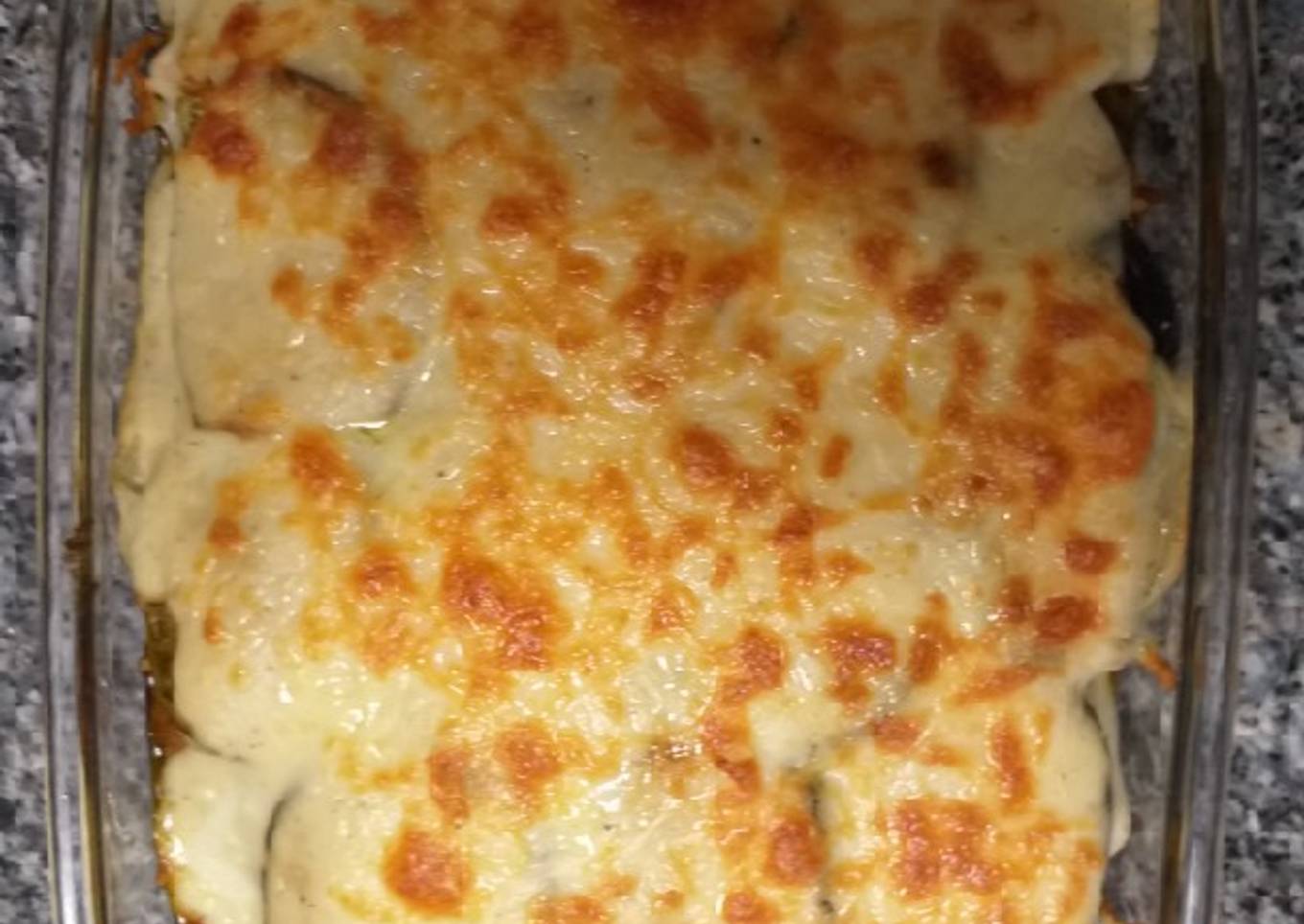 - Y montamos nuestra lasaña, en el recipiente que se vaya a utilizar, cubrimos el fondo con tomate frito o bechamel y ponemos una capa de berenjenas y la cubrimos con la carne y así vamos haciendo las capas que queramos. En la última capa de berenjena cubrimos con bechamel y queso rallado y lo llevamos al horno precalentado 180° unos 10 o 15 minutos, o cuando esté dorado el queso.