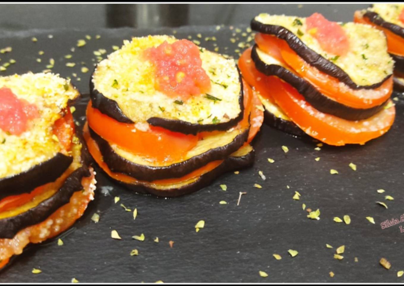 - Armamos las mil hojas, con capas de berenjenas y tomate, terminos con la mezcla del pan ralllado y rociamos con aceite de oliva, llevamos a horno caliente durante unos minutos, Servimos