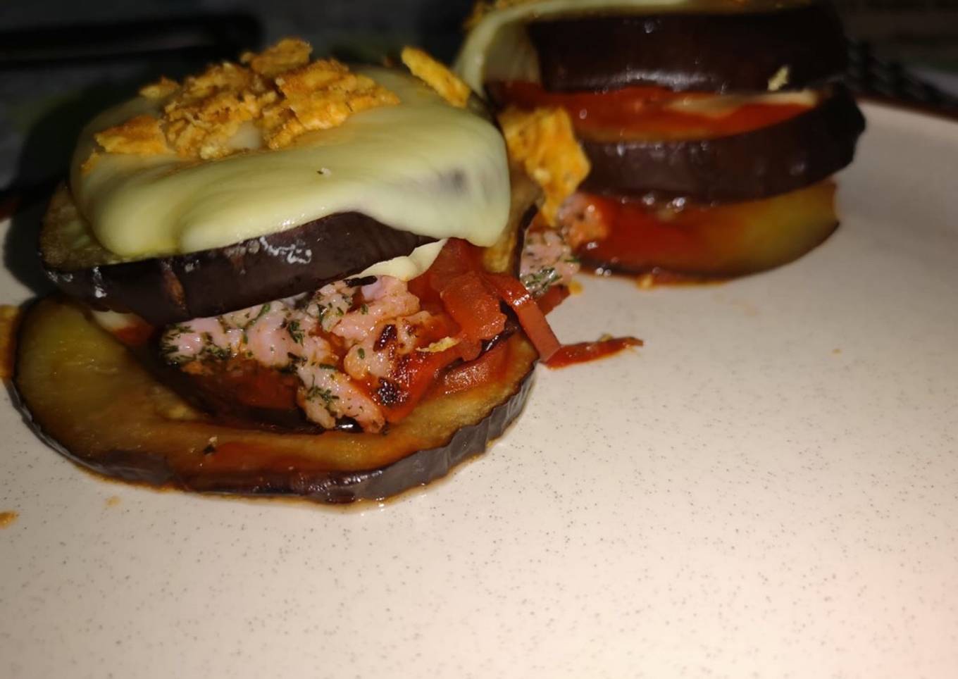 - Sacamos las berenjenas y vamos montando capa de berenjena queso azul tomate, tomate frito carne y queso normal y así sucesivamente