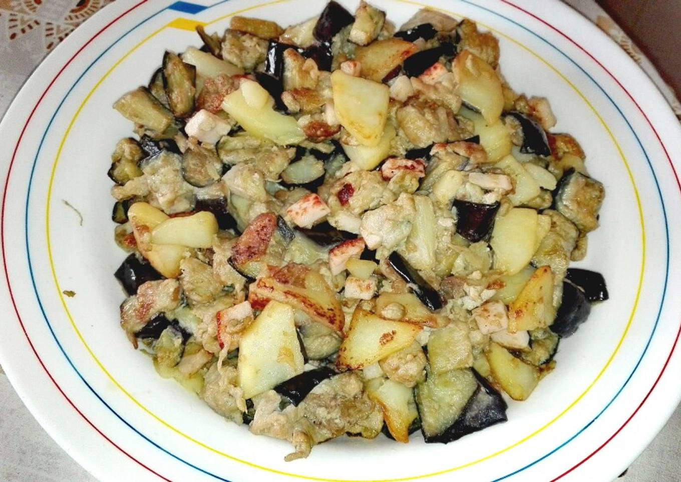 Revuelto de berenjenas, patatas y pavo