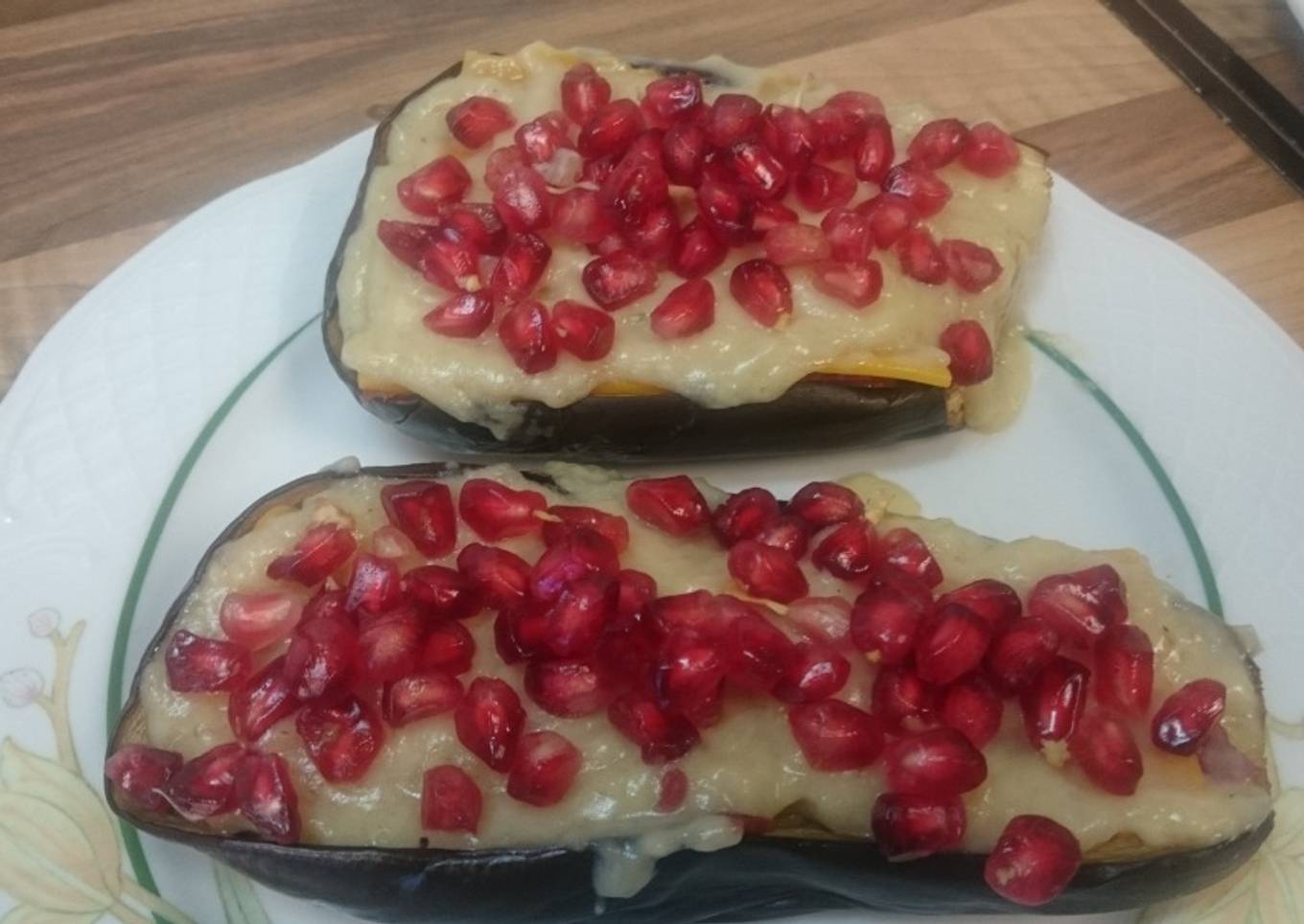 - Salpimentar las berenjenas, colocar la panceta, repartir el bechamel caliente y la granada, servir con unas patatas fritas con perejil y huevo rotos.