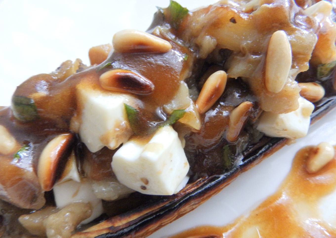 - Servir las berenjenas en el plato aliñadas con la vinagreta, mezclada con los piñones tostados... Espero que os guste !!