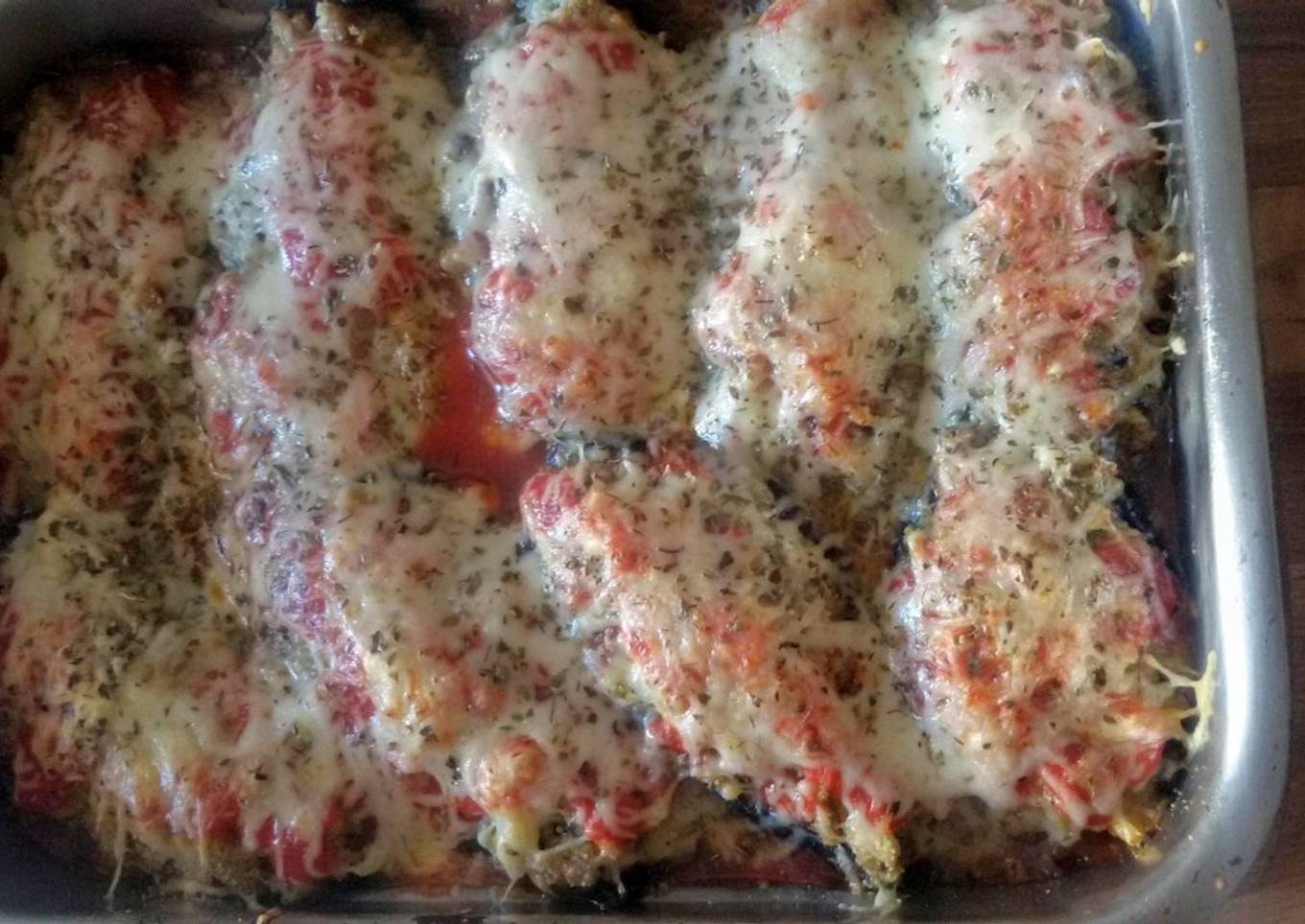 - En la fuente se pone en el fondo un poco de tomate frito, se colocan las berenjenas, se añade un poco de pan rallado, tomate frito, queso emmental y un poco de orégano y a hornear.