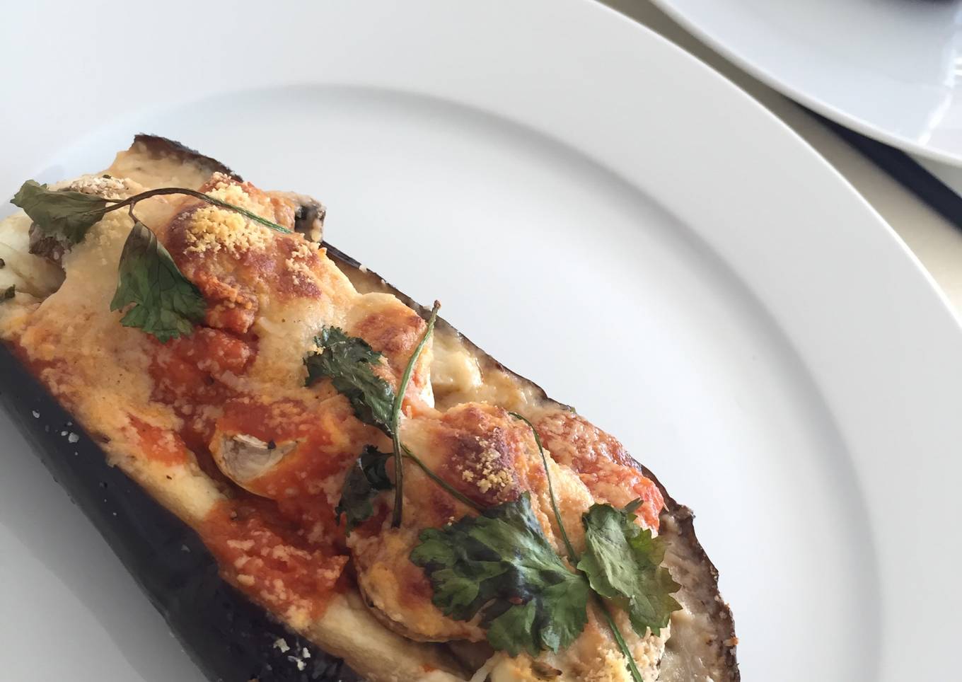 - Añadir dos cucharadas de parmesano por cada mitad de berenjena. Y encima poner el cilantro.