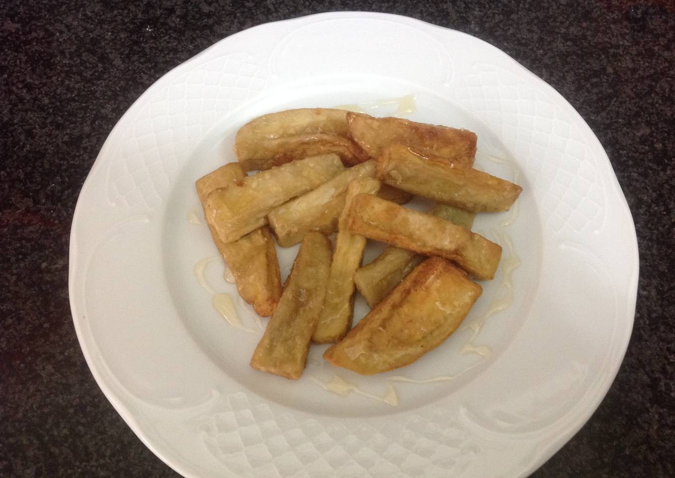 - Lo primero que haremos será pelar las berenjenas y cortarlas en forma de prismas rectangulares, lo que llamamos cantones; estos los introducimos en un recipiente para a continuación cubrirlos con cerveza donde deben permanecer más de 15 minutos.