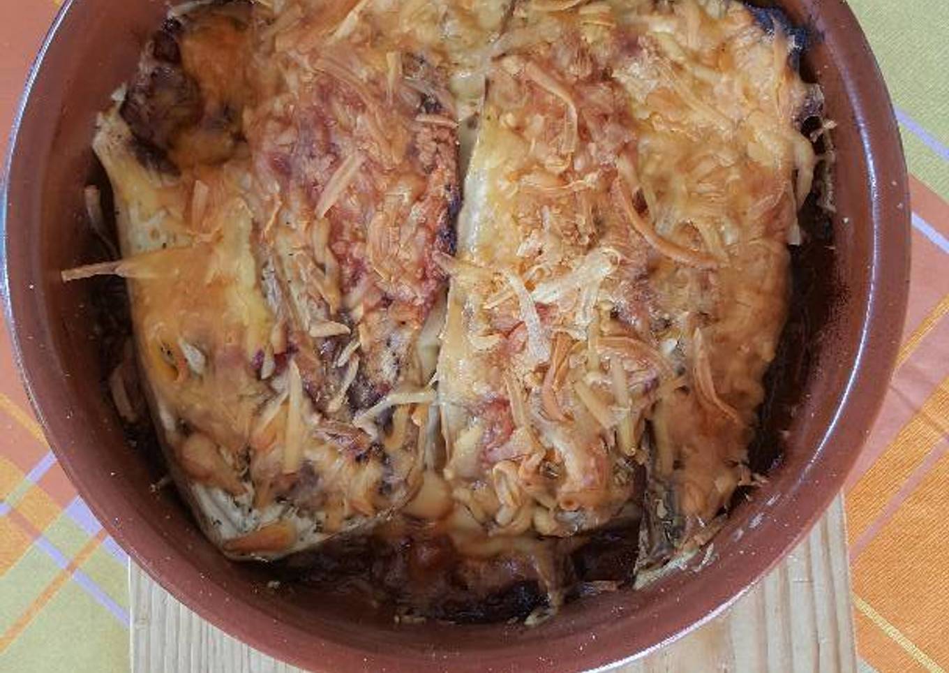 - Por último en la parte superior, sobre la última capa de berenjena esparcir queso rallado y orégano