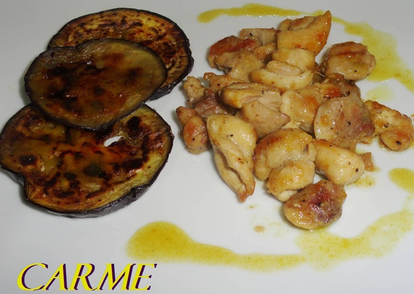 He pasado el pollo por la sarten, le he agregado mostaza y miel y como guarnición berenjenas a la plancha con la misma salsa de mostaza y miel.