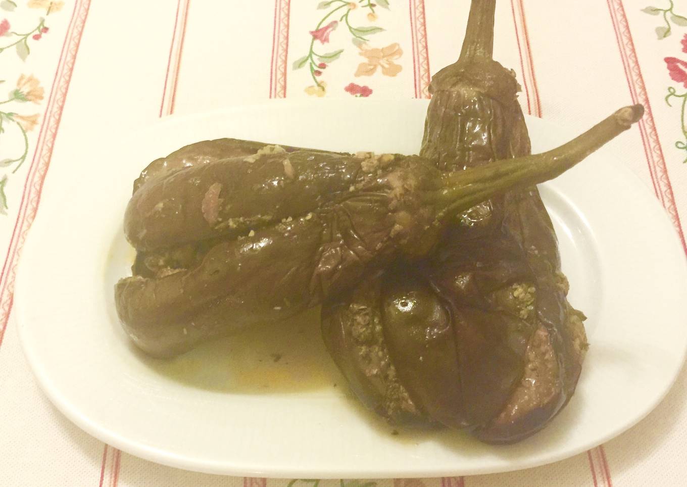 - Hacemos una cruz en las berenjenas a lo largo sin cortarlas del todo las lavamos y escurrimos bien y freímos en bastante aceite caliente,dejamos escurrir bien lavamos todos los otros ingredientes y los preparamos.