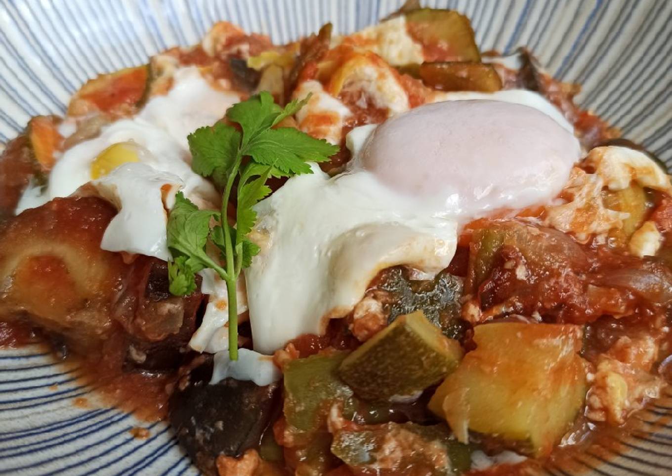- El pisto ya está hecho, yo he tomado una porción de pisto y lo he pasado a una sartén pequeña, lo he puesto a calentar a fuego medio y cuando esté caliente le he partido 2 huevos encima para que se cocinen en el pisto.