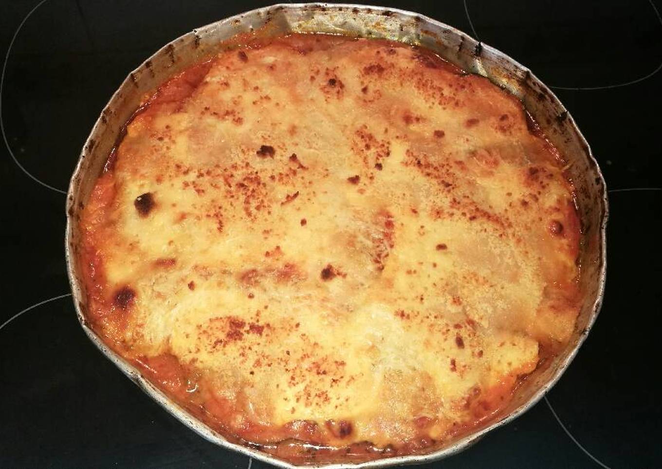 - Calentamos el horno 15' a 200° mientras montamos la lasaña. Colocamos un cucharón del sofrito por el molde colocamos encima las berenjenas cortadas en círculos del mismo tamaño, por encima ponemos el jamón queso y rodajas de tomate natural más sofrito y repetimos lo anterior. Para acabar cubrimos de queso para gratinar y Parmesano