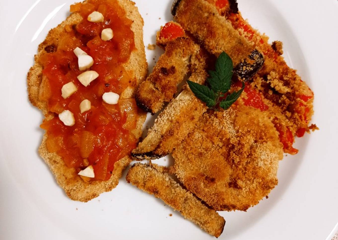 Fin de semana de rebozados. El domingo preparé filetes de merluzas rebozados con salsa napolitana. Para la guarnición aproveché los tres tipos de verduras que tenía en mi nevera: tomates, berenjena y pimiento.