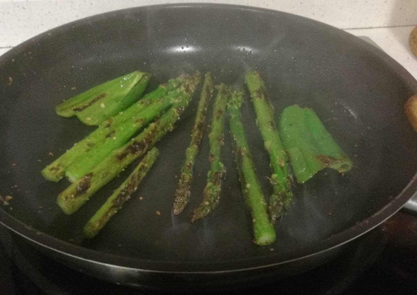 Típico salteado de verduras que nos resuelve una cena. Más si estamos a dieta. En este caso, me contenté con espárragos y pimiento solamente. De todo se puede añadir.